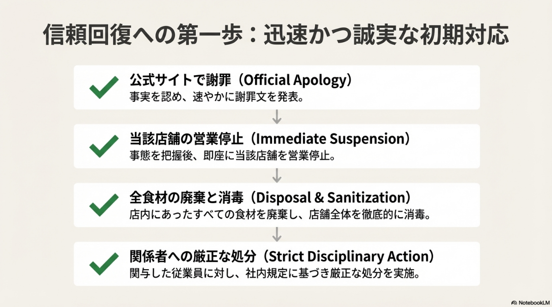 この動画が拡散されるや否や、運営会社である日本ピザハット株式会社は迅速に動きました。事態を把握した後、即座に当該店舗を営業停止とし、店内にあったすべての食材の廃棄処分、および店舗全体の徹底的な消毒作業を実施しました。また、関与した従業員に対しては社内規定に基づいた厳正な処分を下し、公式サイトを通じて速やかに謝罪文を発表するなど、事実を隠蔽することなく、真正面から問題に向き合う姿勢を示しました。